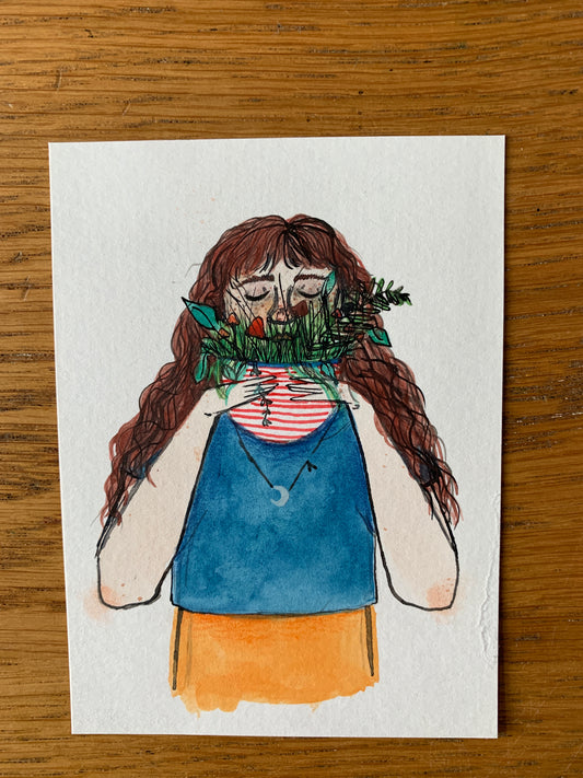 Original - Sketchbook Gal with Hot chocolate in ink, watercolour and pencil with collage