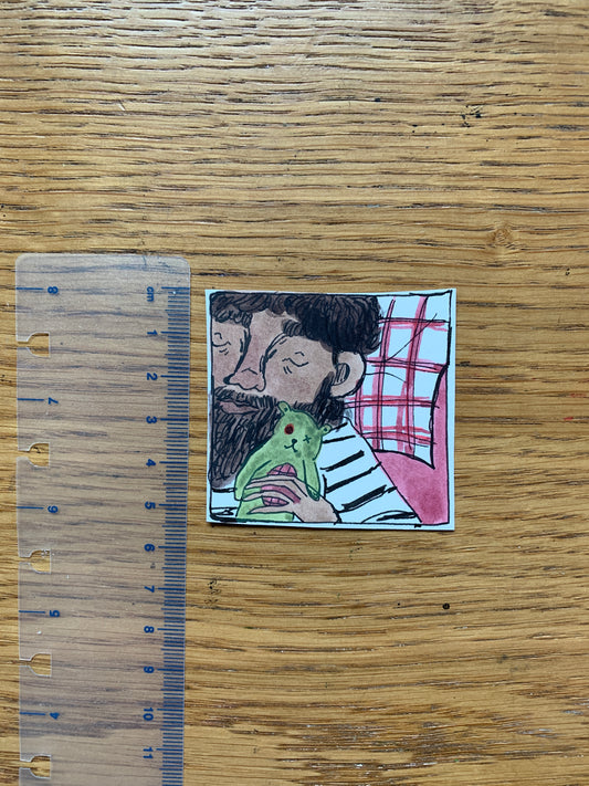 Original - Mini square portrait in ink and watercolour - sleeping with teddy bear