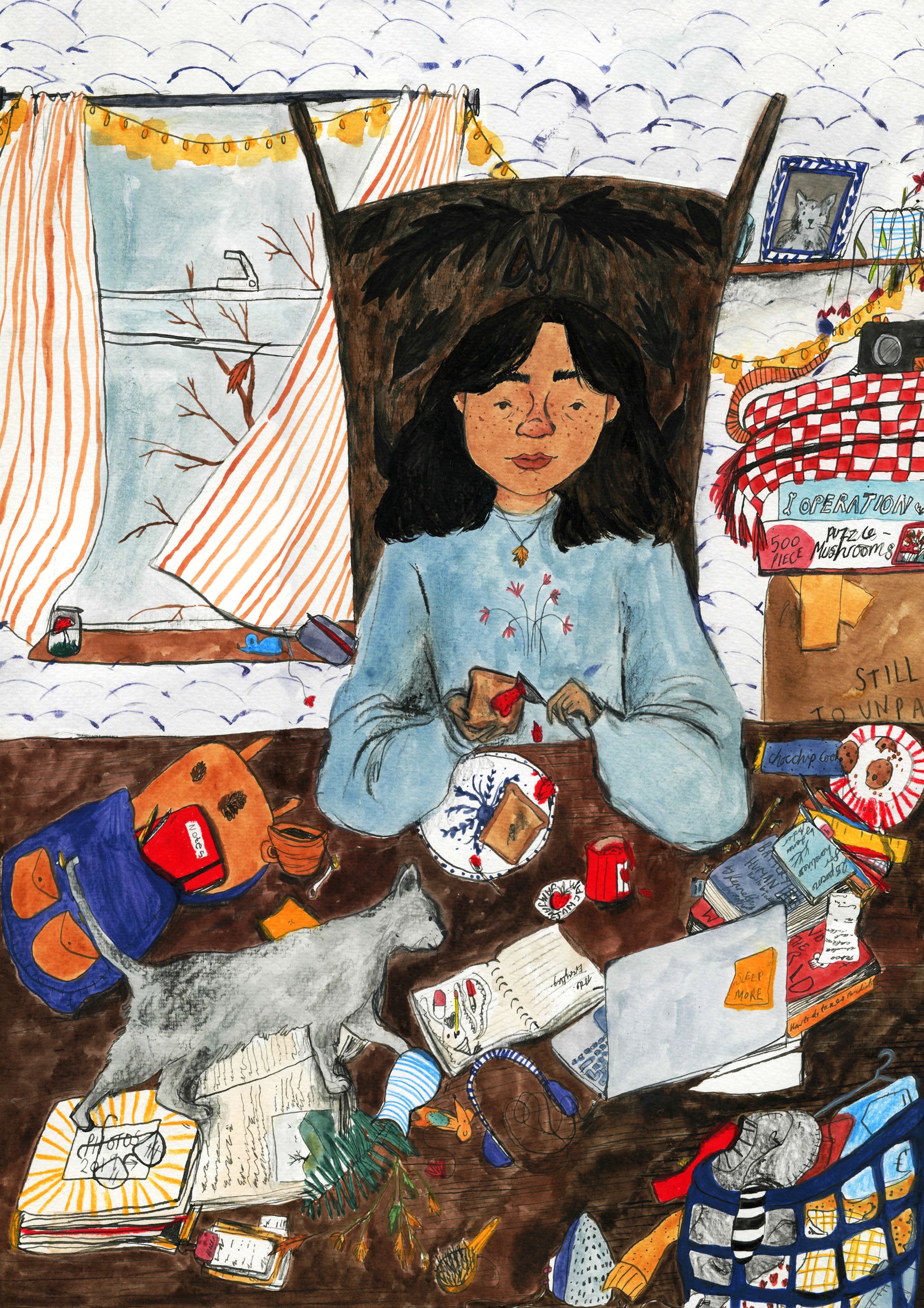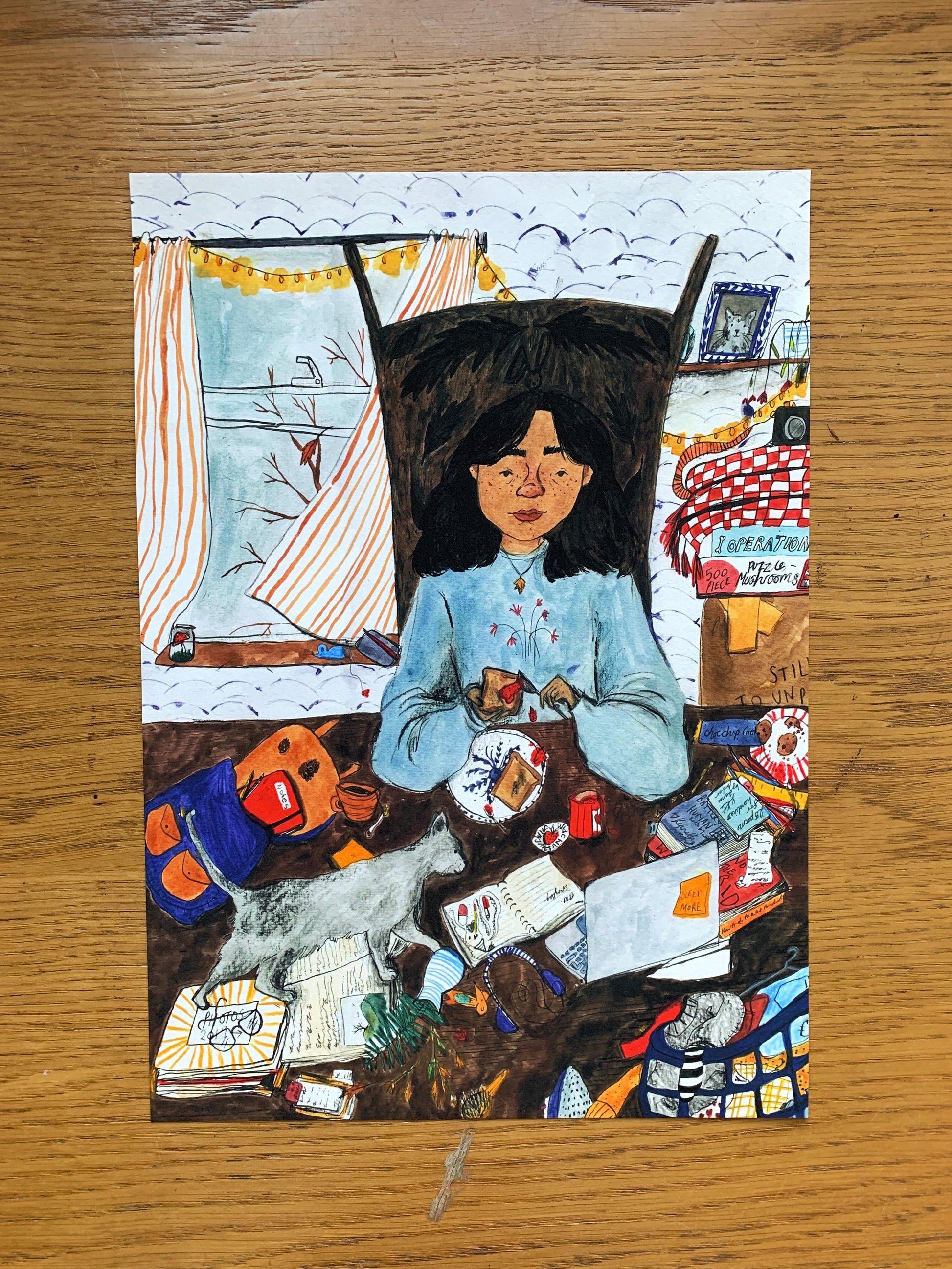 This is a print of a traditionally made drawing and painting in ink, watercolour, gouache, coloured pencils, crayons and pastels. My drawings are then only lightly edited in photoshop to bring out the colours and definition of the drawing.