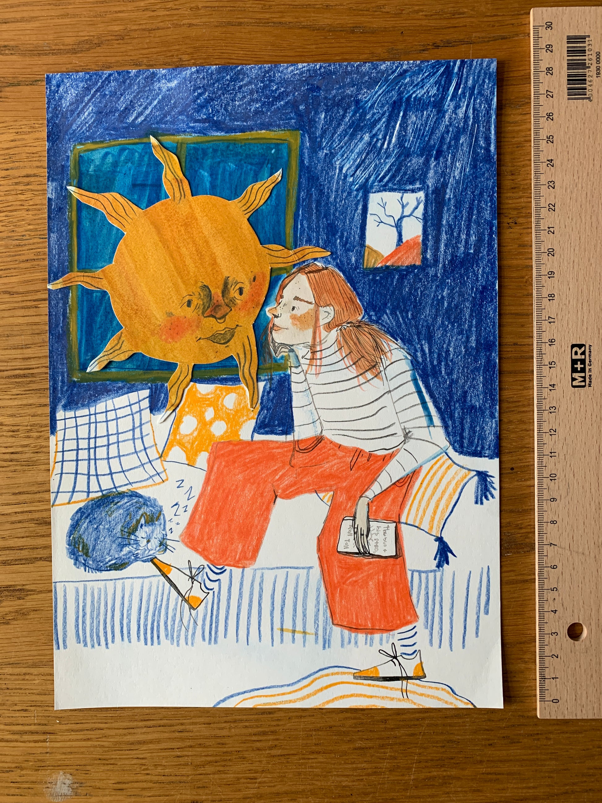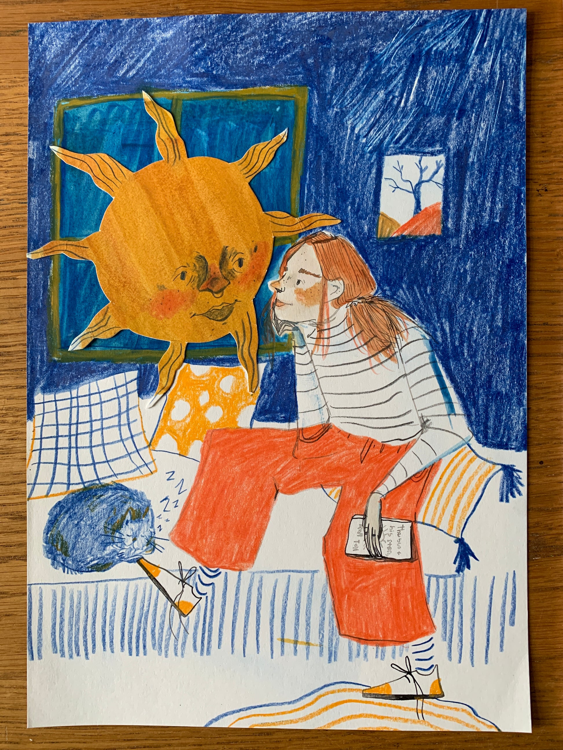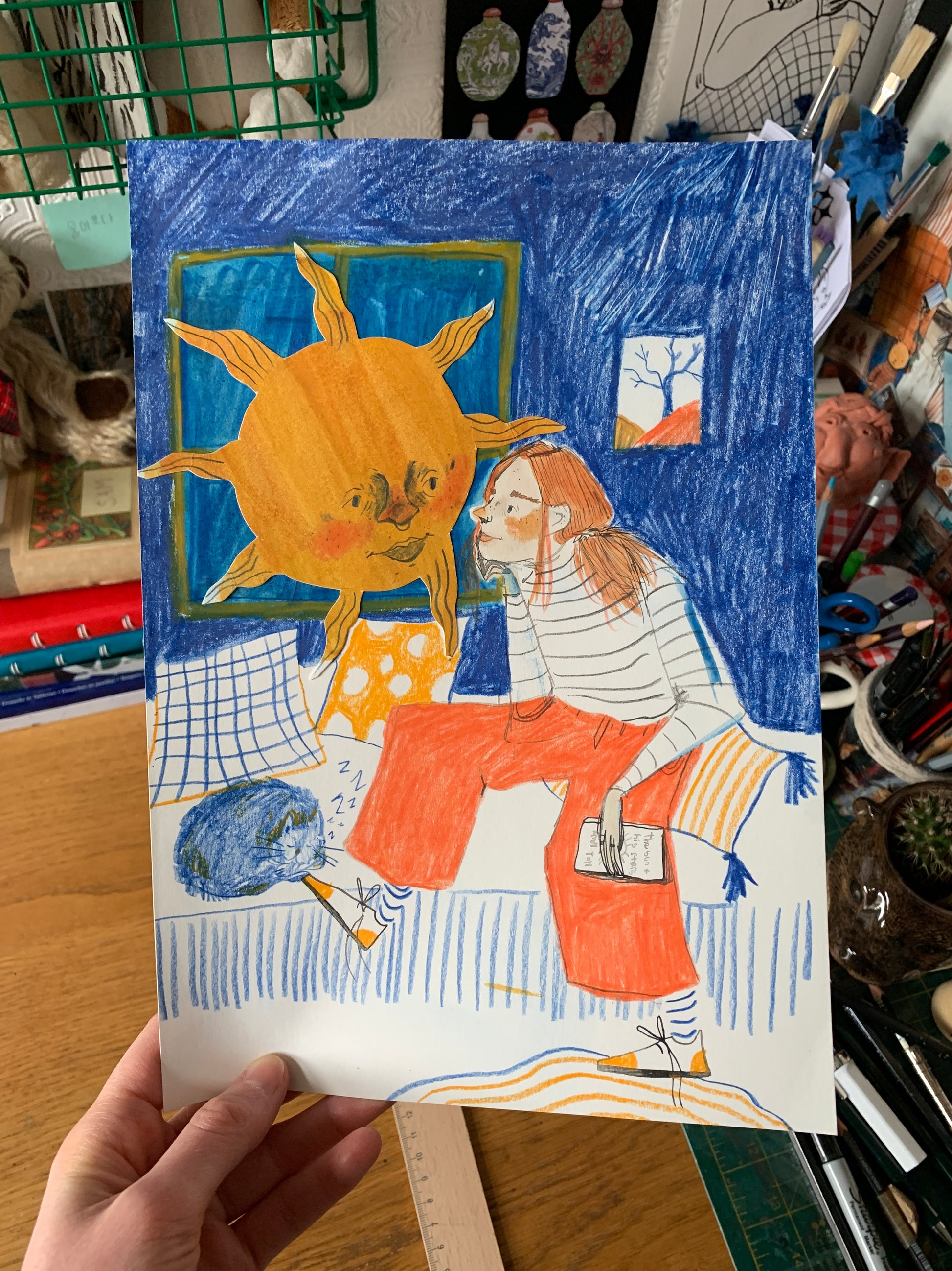 This is an original piece made using ink, watercolour, coloured pencil and collage. This piece needs to be handled with care to avoid smudging the coloured pencil and tearing the collaged sun.
