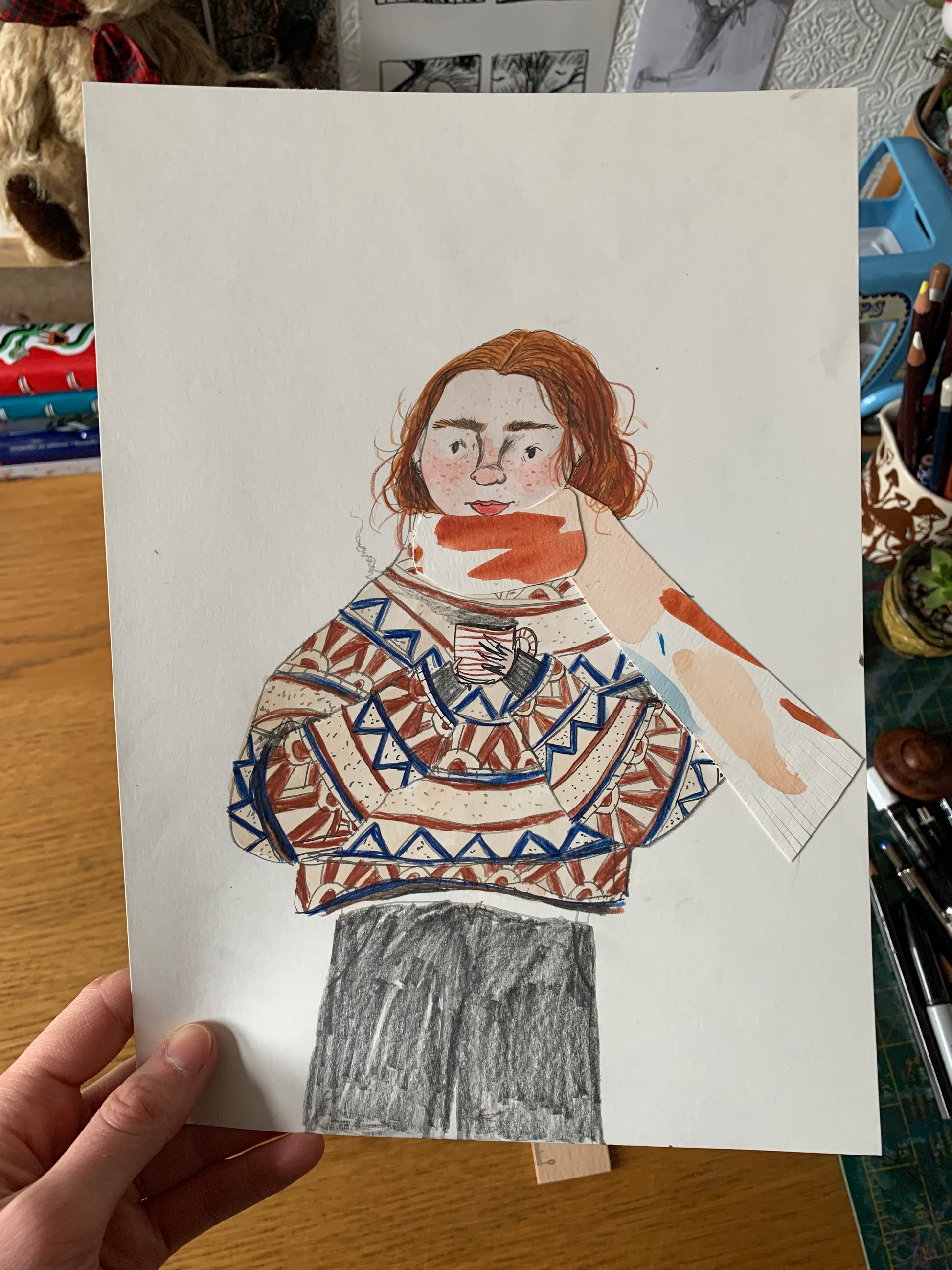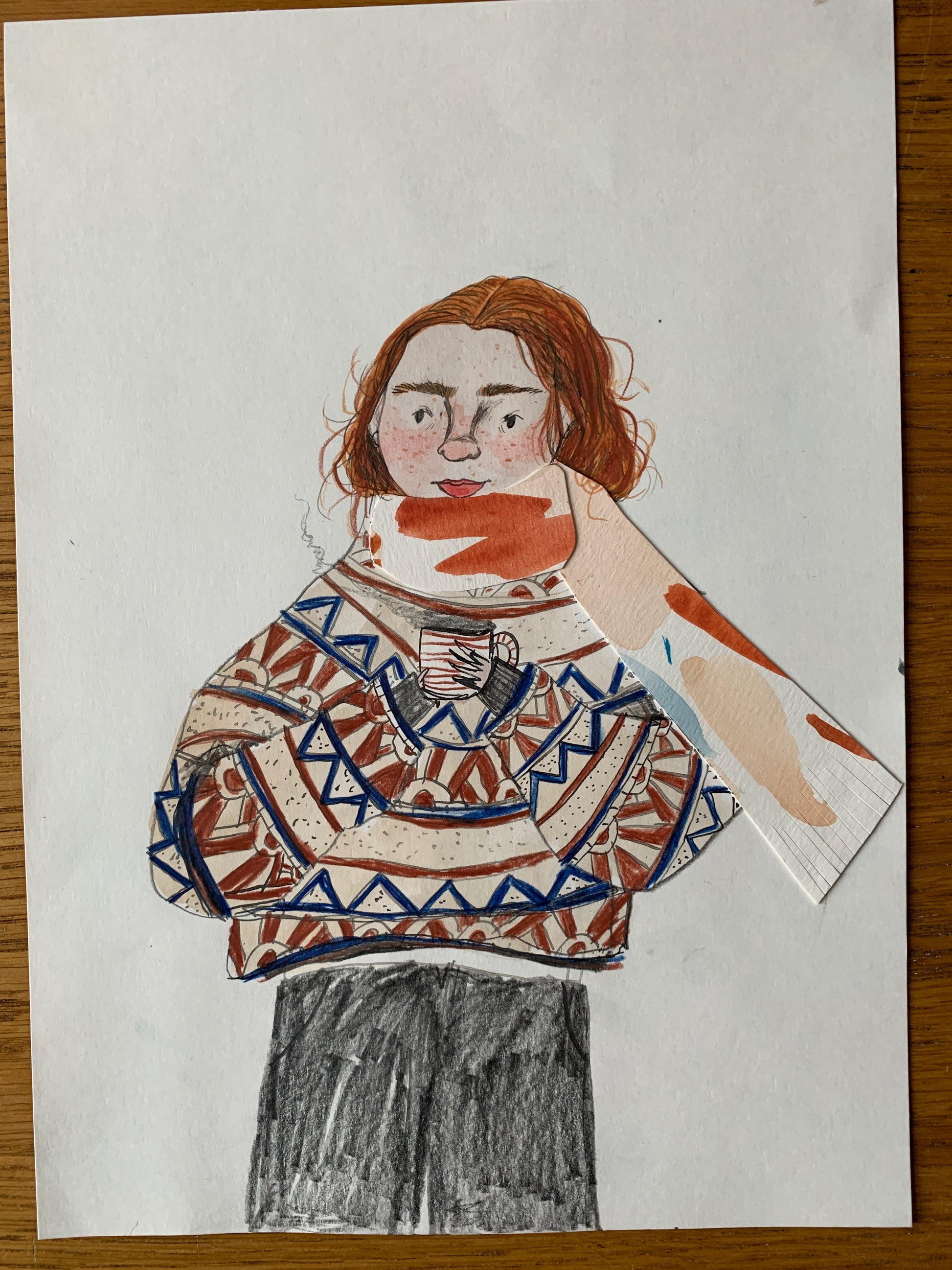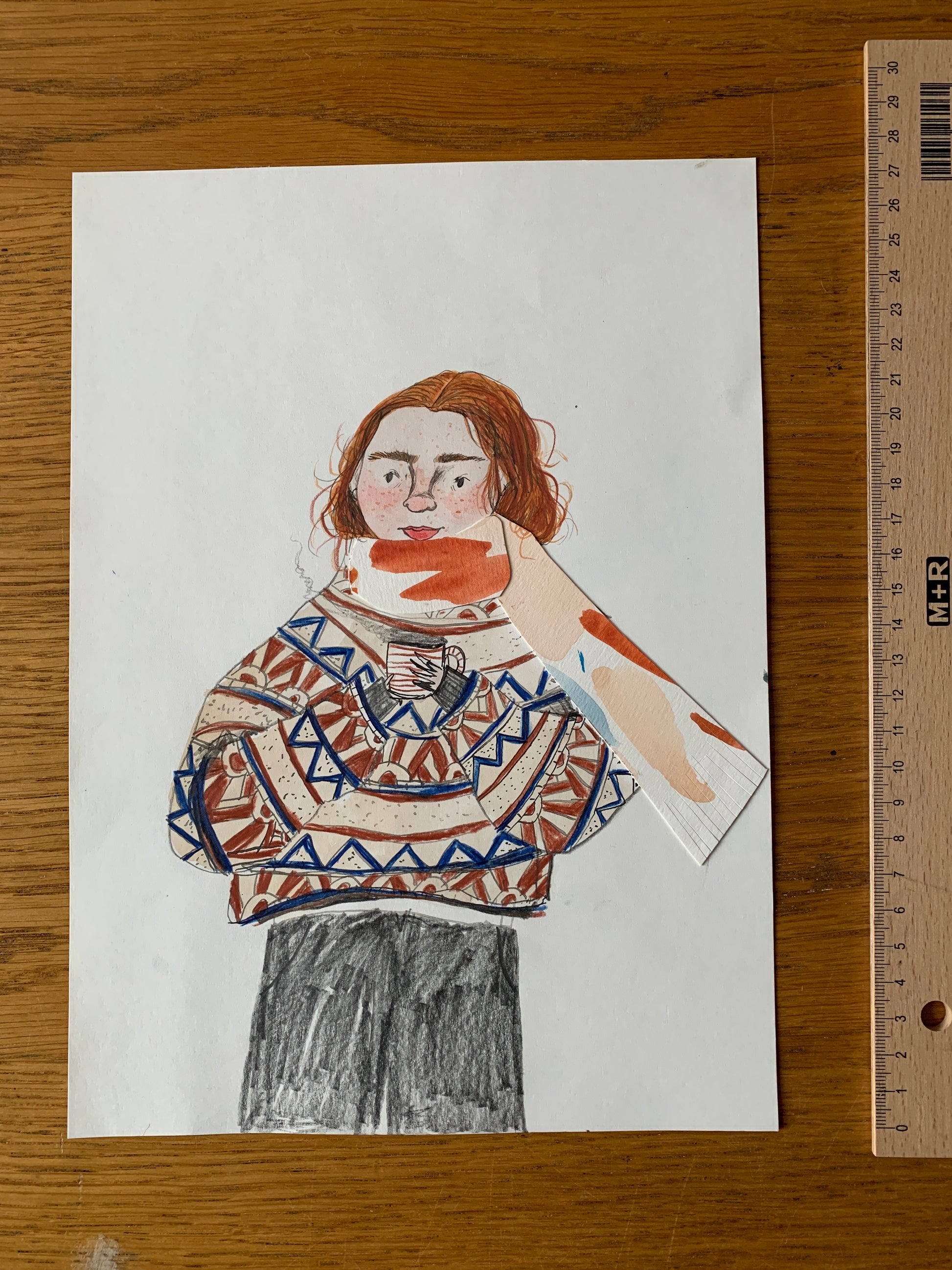 Original - Sketchbook Gal with Hot chocolate in ink, watercolour and pencil with collage