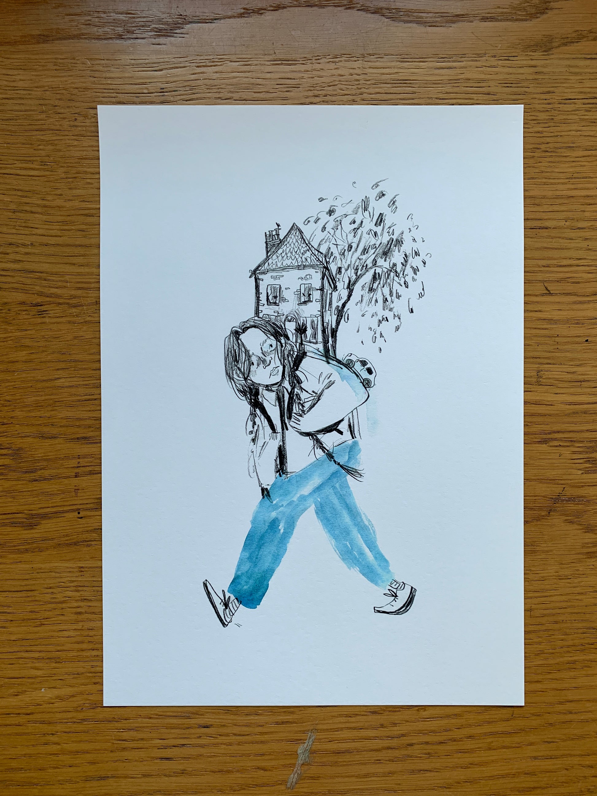 This print is one of the many drawings I've made whilst challenging myself to sketchbook more, I often use what I call my 'jar of destiny' to pick out a random topic and then I sketchbook on it for about an hour, this drawing was on the theme 'Buildings' and ended up being themed around the lack of affordable housing and how owning a home is such a burden.